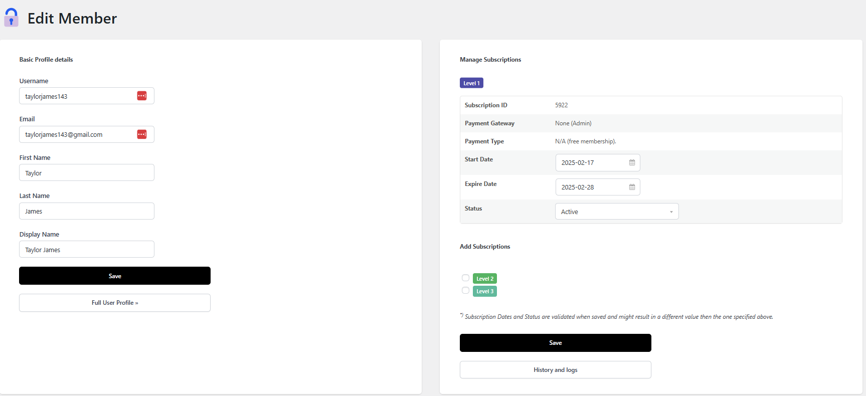 Here you can see such info as the subscription start date, expiration date, which payment gateway they signed up on, and the status of their subscription. You can also change the status of their subscription on this page using the Status dropdown and clicking Save after you’ve made your selection.